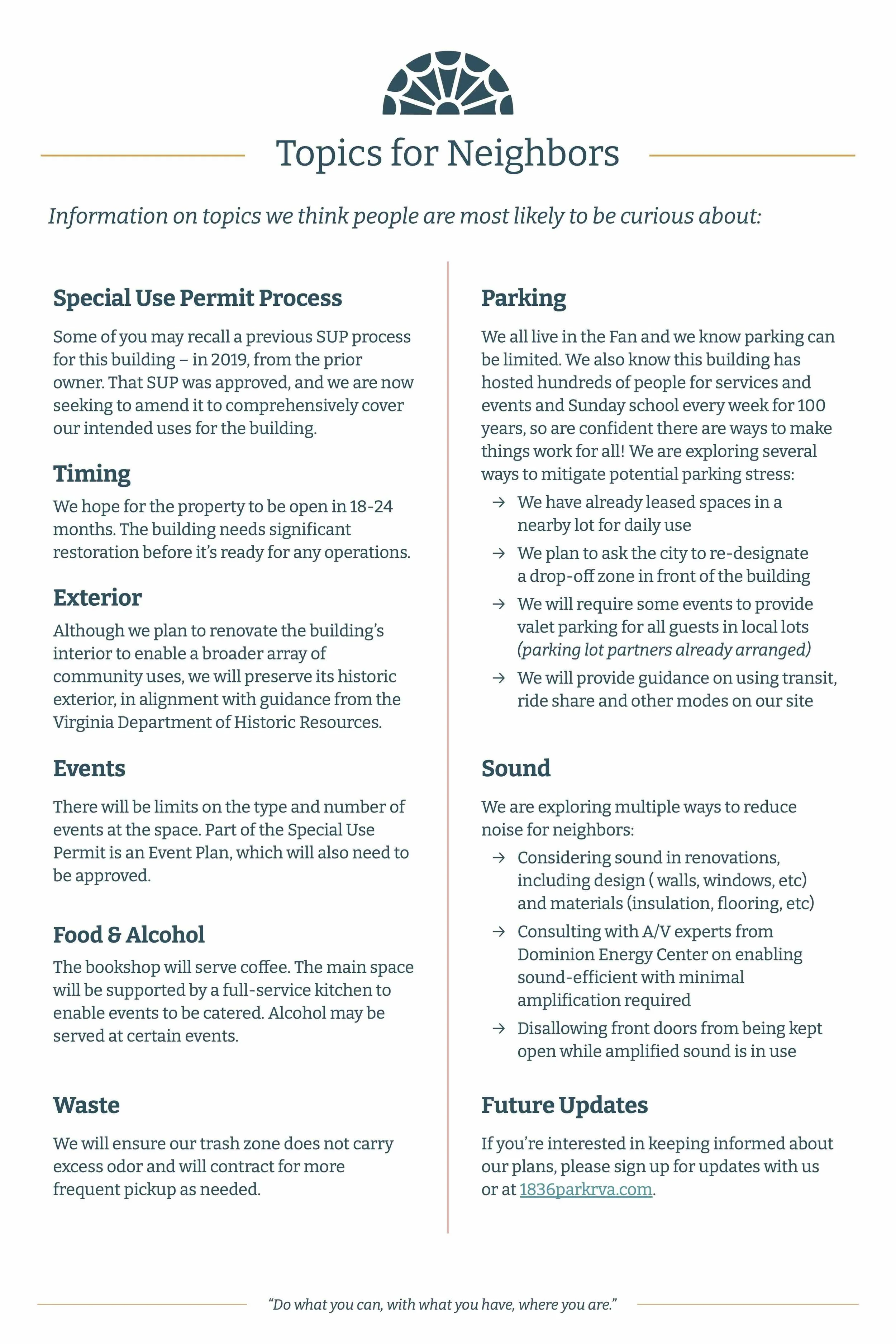We are updating the Event Parameters based on neighborhood input – from last Monday’s meeting, emails, 1:1 conversations, and elsewhere. Our next update to all of you will include the latest version.